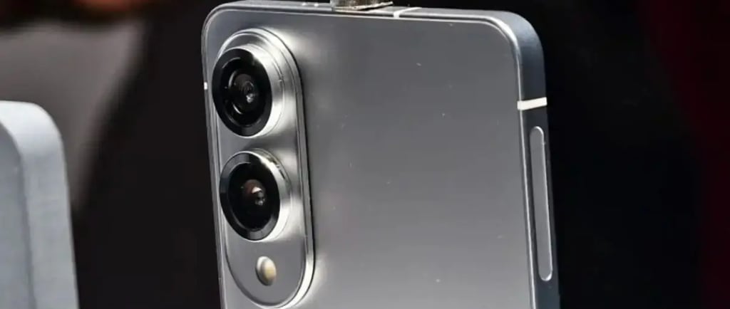 O visual traseiro adota um layout vertical com duas câmeras dispostas em um módulo em formato de pílula, semelhante ao estilo do iPhone 16. Essa estética reforça a proposta premium e minimalista do modelo.